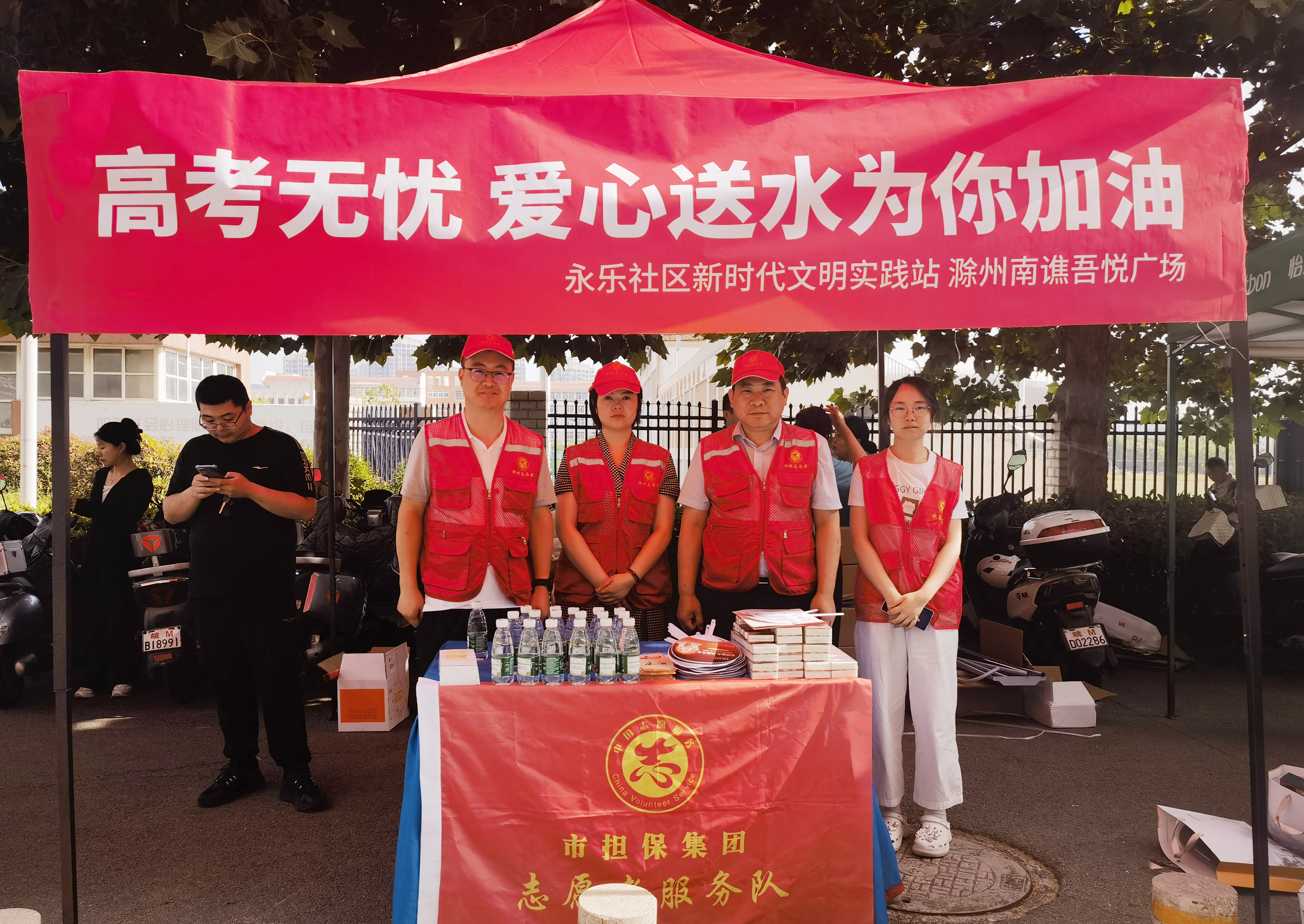 考場外,市擔(dān)保集團(tuán)聯(lián)合永樂社區(qū)設(shè)立了愛心驛站,搭建遮陽棚,布置休息、乘涼等候區(qū),為過往考生、陪考家長免費(fèi)提供礦泉水、扇子、清涼油等防暑降溫物品和應(yīng)急文具。同時,志愿者們主動服務(wù),與考生家長熱情交流,緩解他們的緊張情緒。